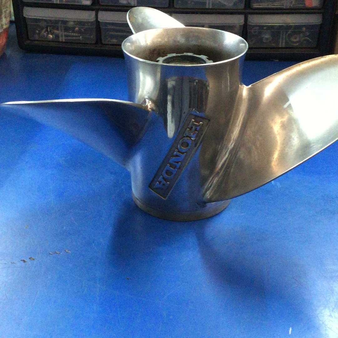 Used Honda 3-Blade Stainless Steel Propeller, 13 1/4 x 17. Part Number 08M60-ZW7-A10. Good condition. 15 Spline.