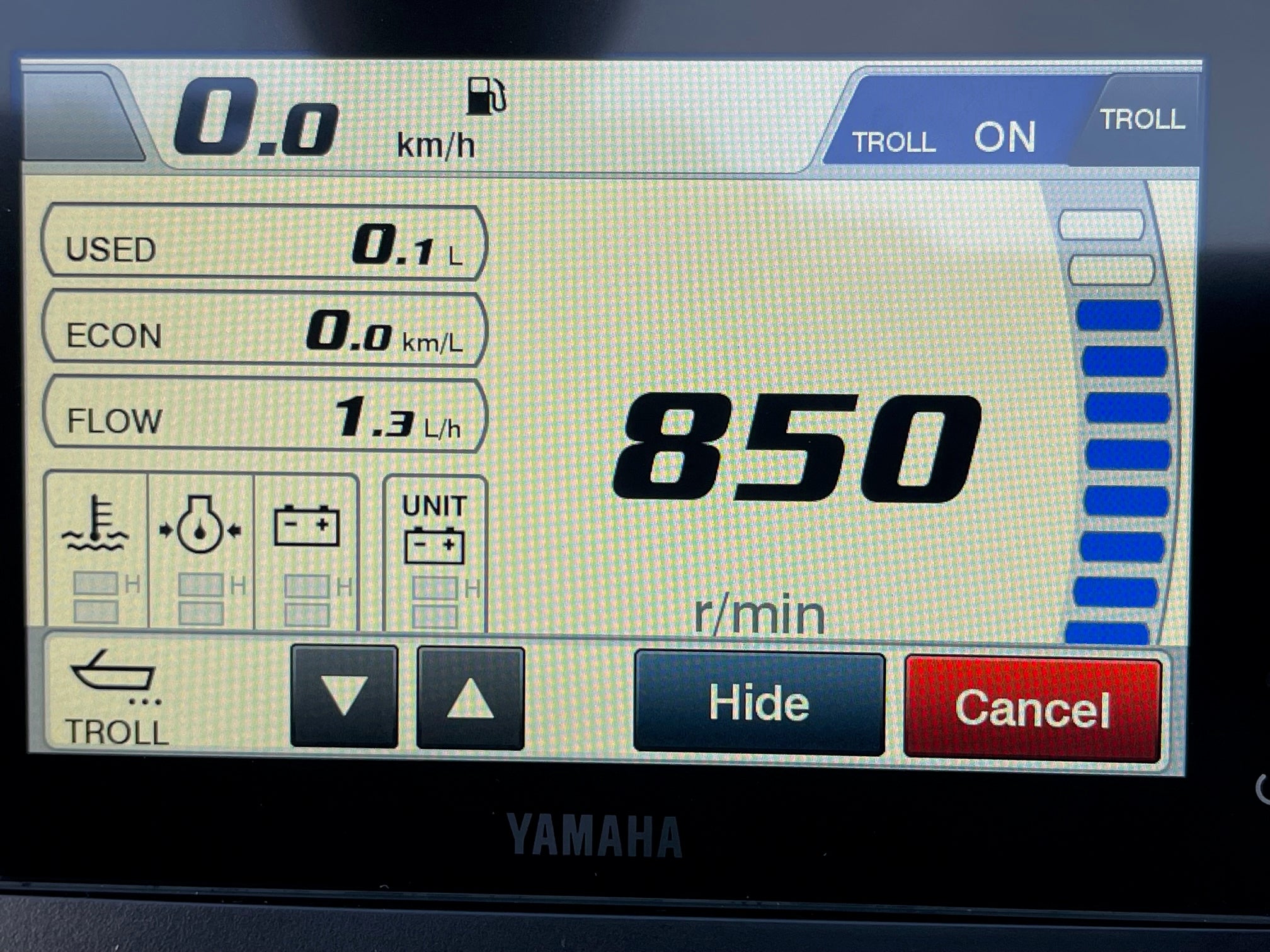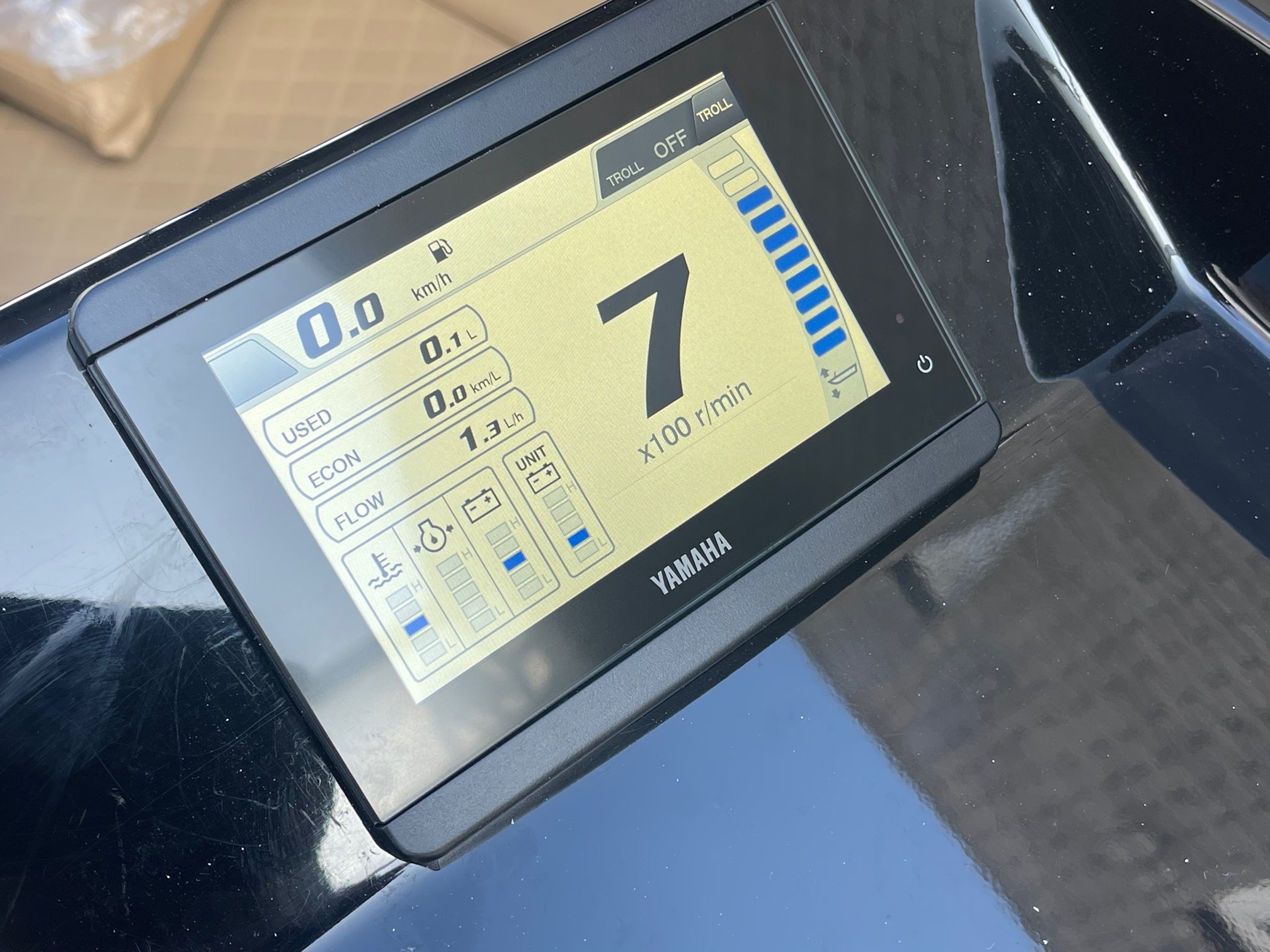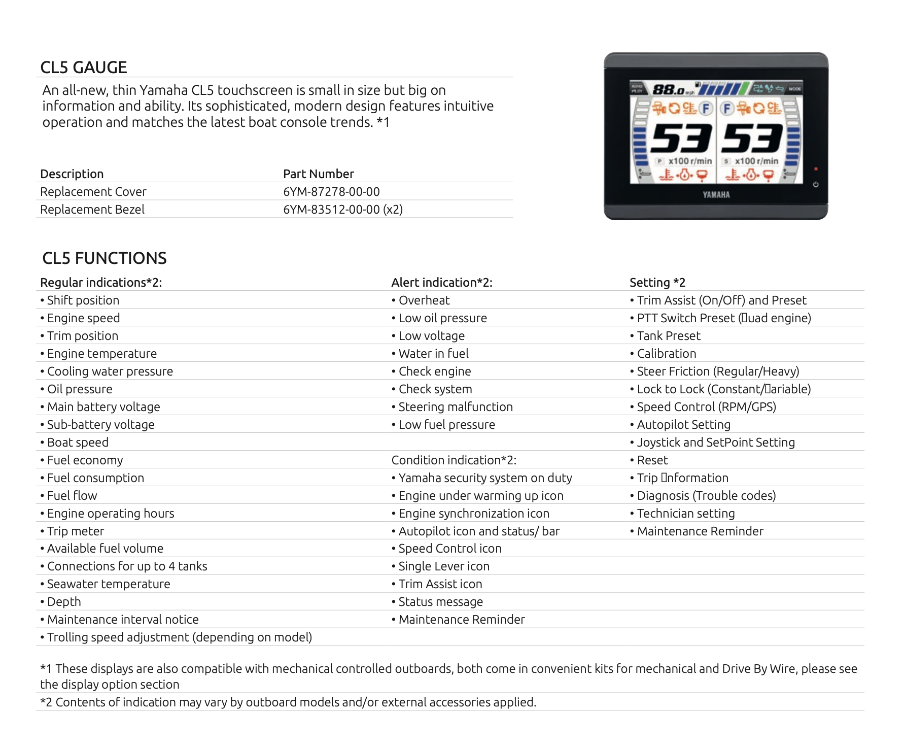 With the new Yamaha CL5 touch-panel info screen, you have all the information needed to monitor the performance and efficiency of the engine and your vessel, such as engine speed, hours of operation, trim angle, oil pressure, and warning lights. The combined speed and fuel management gauge displays boat speed, fuel supply, and fuel consumption.