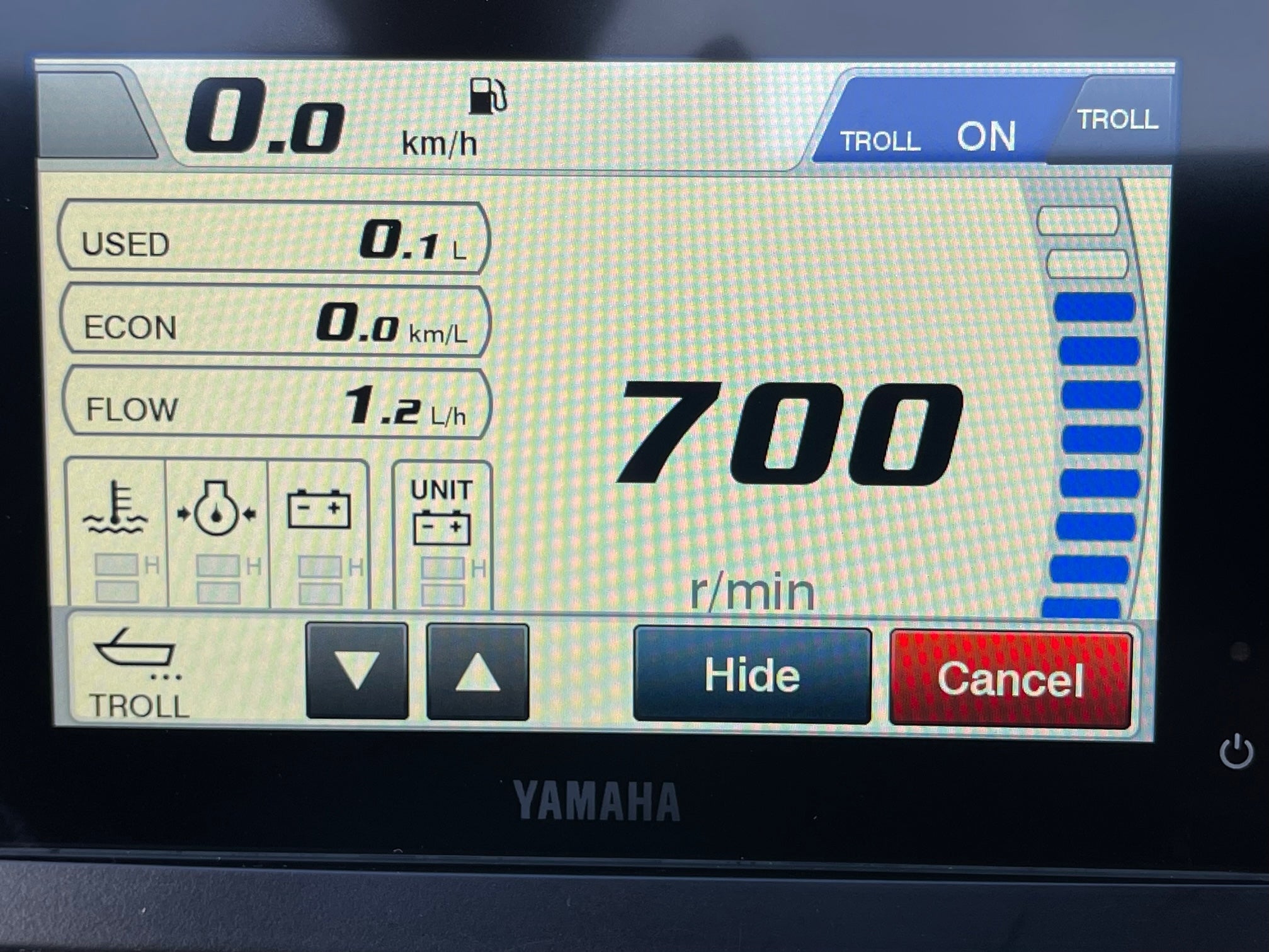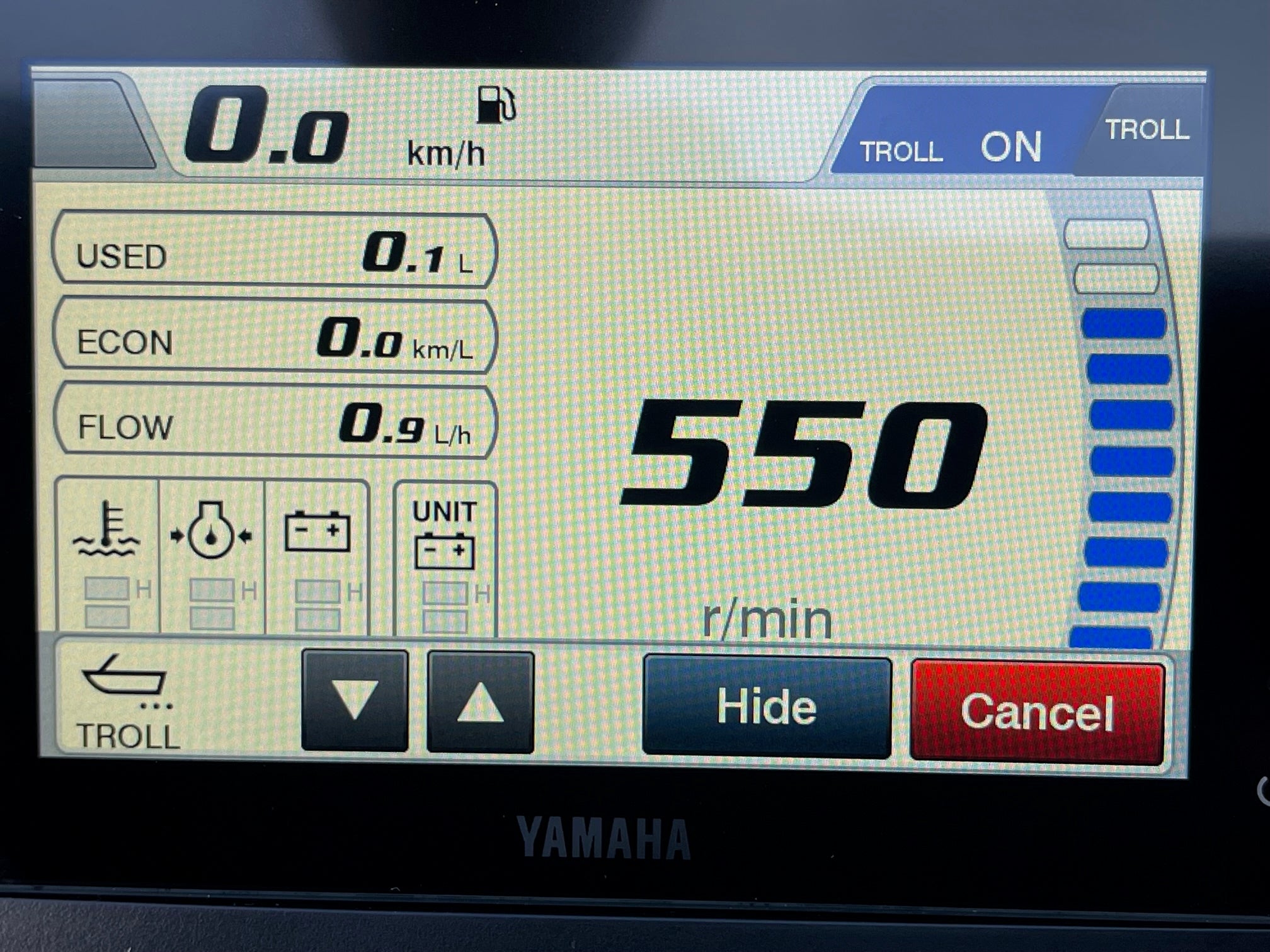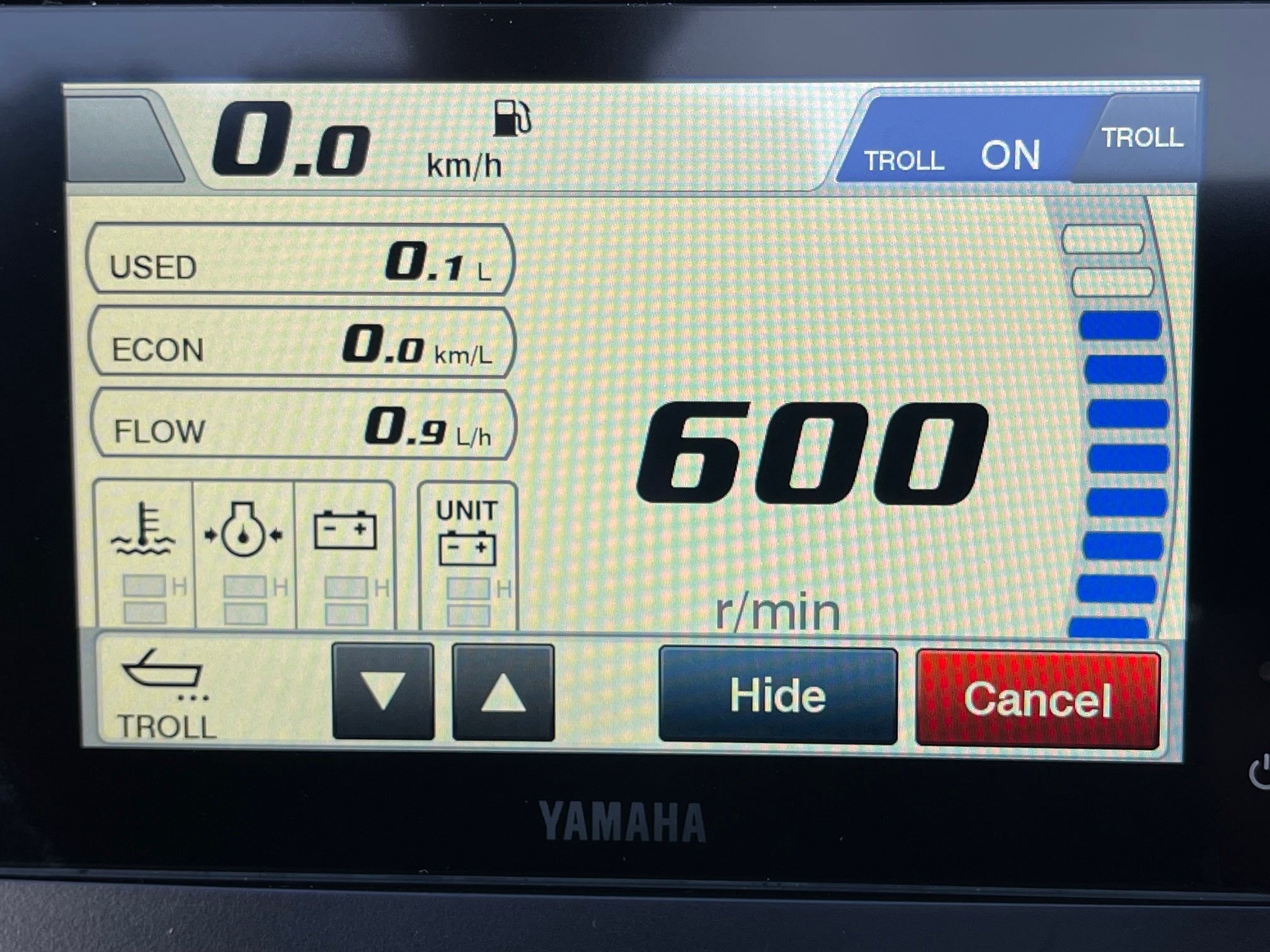 With the new Yamaha CL5 touch-panel info screen, you have all the information needed to monitor the performance and efficiency of the engine and your vessel, such as engine speed, hours of operation, trim angle, oil pressure, and warning lights. The combined speed and fuel management gauge displays boat speed, fuel supply, and fuel consumption.